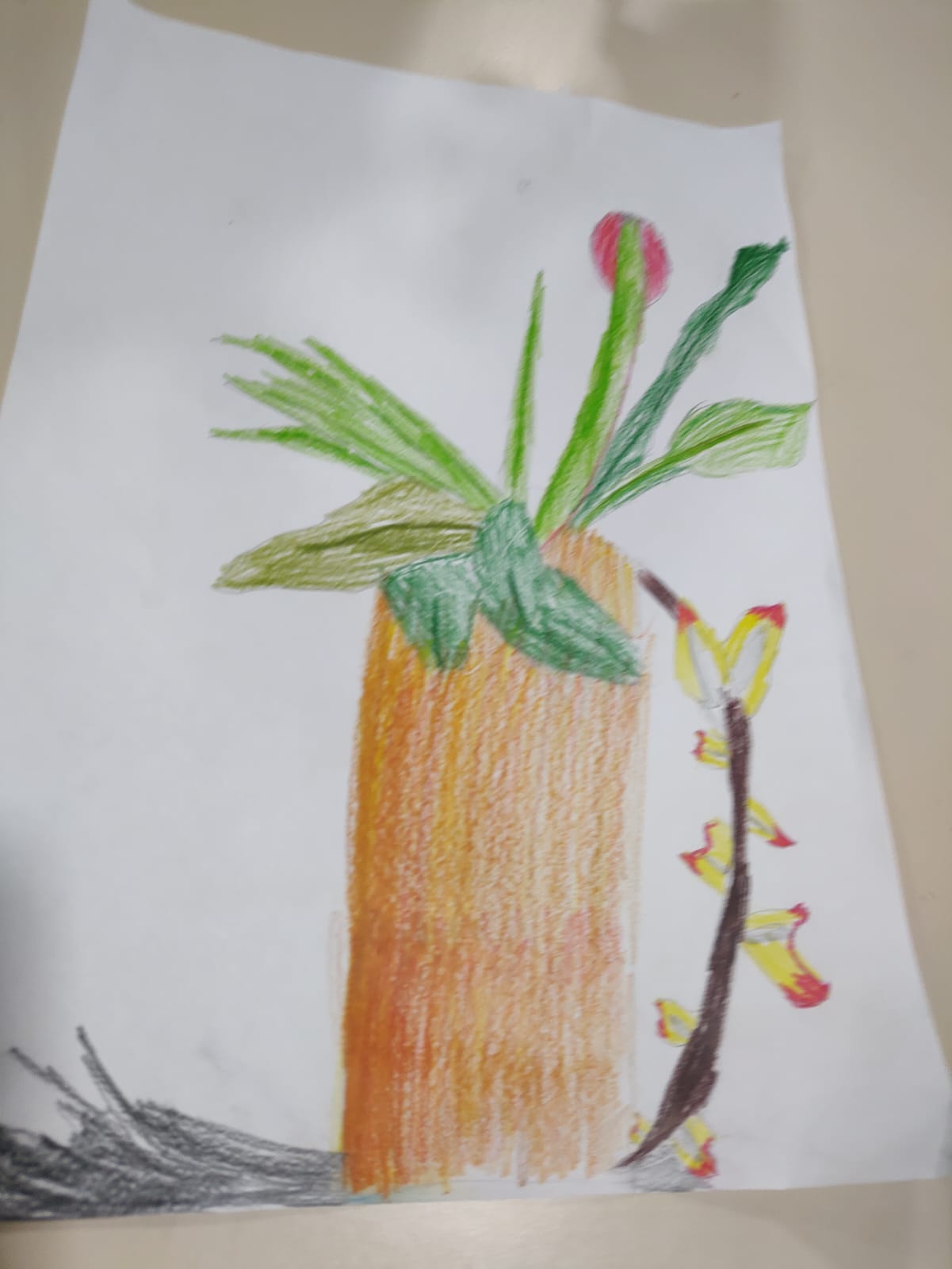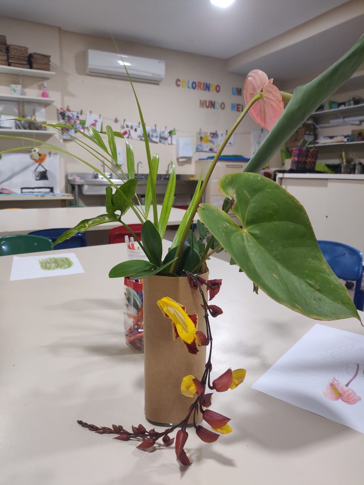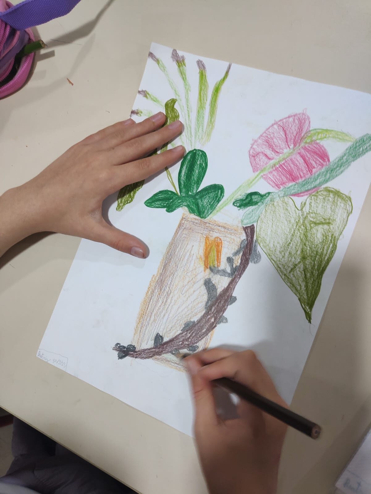 Recentemente, a professora Cláudia, responsável pela oficina, propôs uma dinâmica de Desenho de Observação utilizando um vaso de flores colocado ao centro de uma mesa. Com as crianças dispostas em diferentes posições ao redor do objeto, a